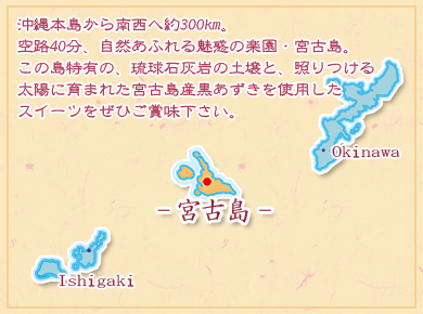 琉球石灰岩の土壌と、照りつける太陽、豊かにそよぐ風の環境の中でたくましく育まれた、古くから宮古人の生活に慣れ親しんできた厳選黒あずきを使用した豊かな味わいのスイーツたちをご賞味下さい。 |